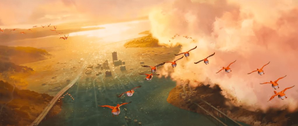 Not only does The Wild Robot take place on a future earth, but it’s an earth that has gone through extreme climate change. One of my absolute favorite shots of the film is of whales swimming over a flooded Golden Gate Bridge. A few other shots show flooded cityscapes. Such a drastic shift in sea level rise implies one of the worst case scenarios of climate change: the complete melting of polar ice sheets.