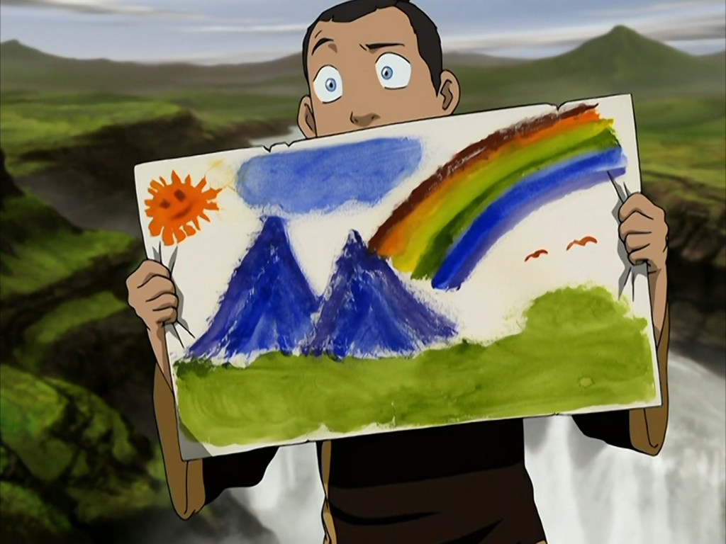 Sokka’s penchant for fun becomes highlighted as a strength of his in Book 3, particularly in the season’s fourth episode, “Sokka’s Master.” It shows in his training with Piandao: painting his own face, landscaping for the sake of relaxation (and a nice drink), and adding a rainbow to his memory exercise. Why else would you add a rainbow except for fun? As Piandao notes, these actions reveal Sokka’s creative mind and versatile thinking–traits that make him a formidable warrior.