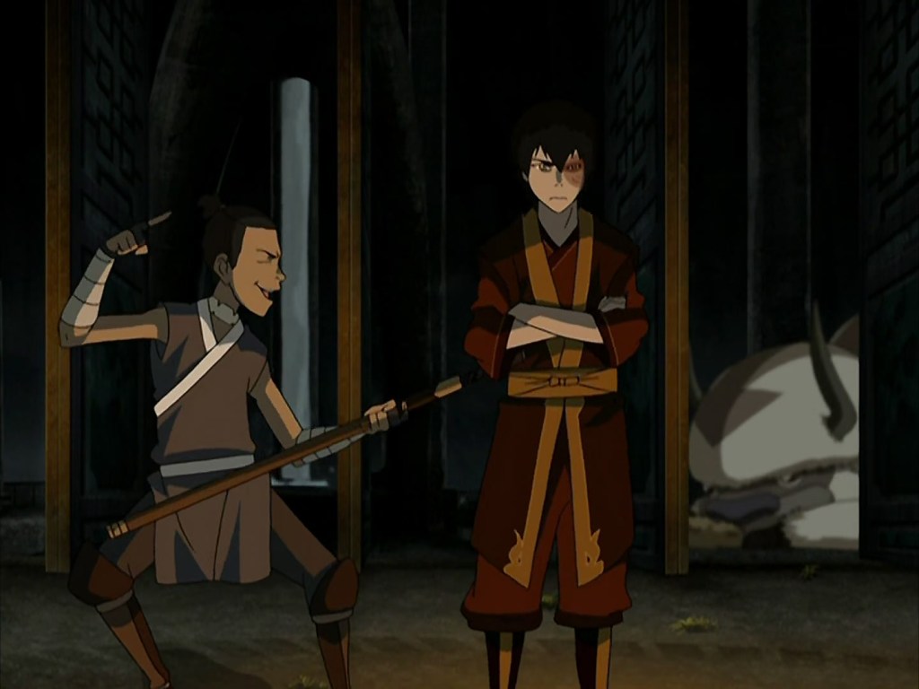 But you put them together and suddenly sending a letter to Katara and saying it’s from Toph (who is blind) is a good idea. They crash into each other trying to bow. Sokka’s plan of getting himself and Aang into the Earth King’s gala involved dressing Momo up as a ghost. They make spooky spirit noises together. It’s just a nice touch that Sokka’s comedy synergizes well with Aang, who is much more fun-loving than Sokka is, but isn’t as comedic of a character.